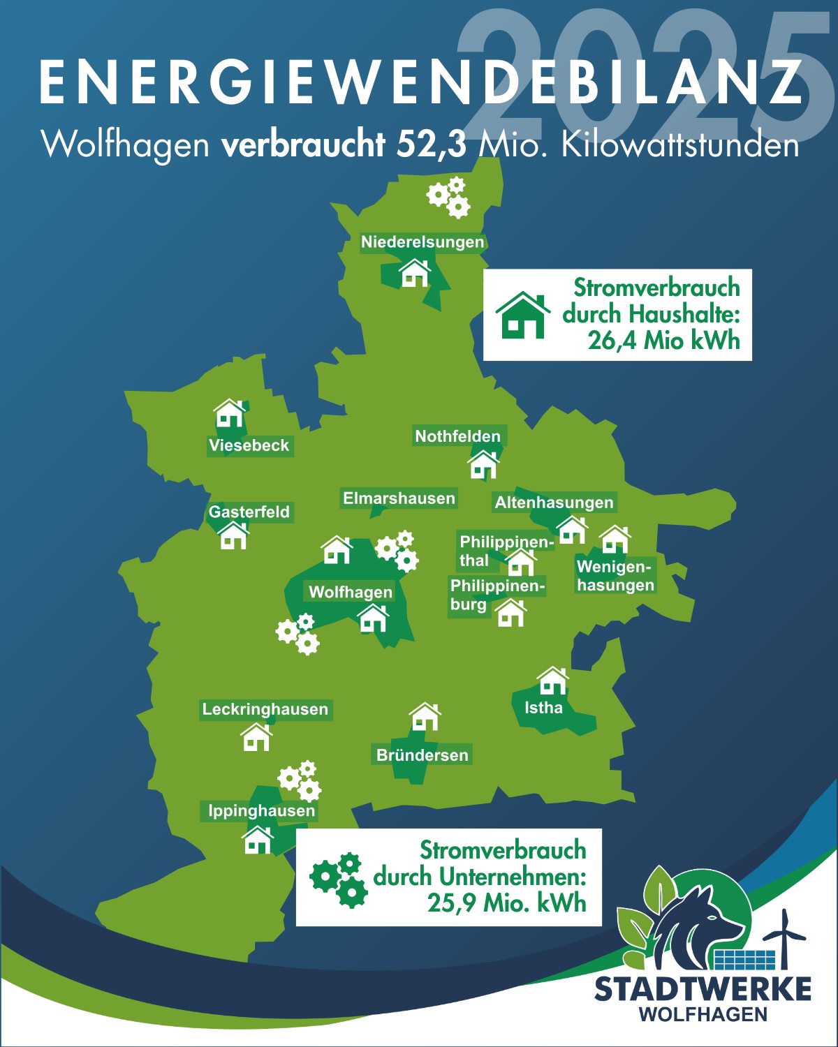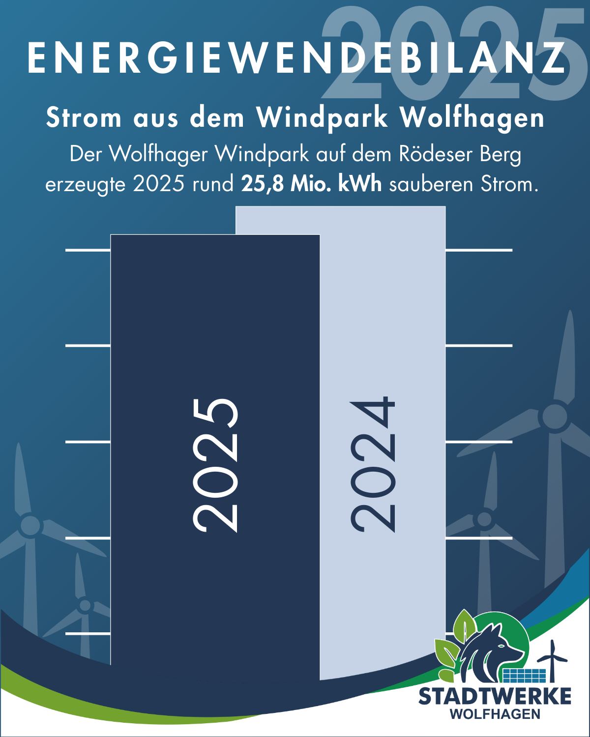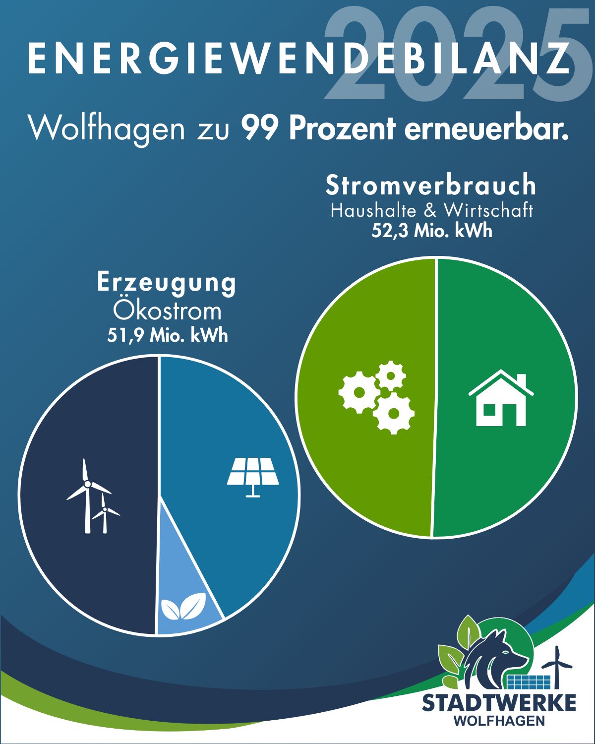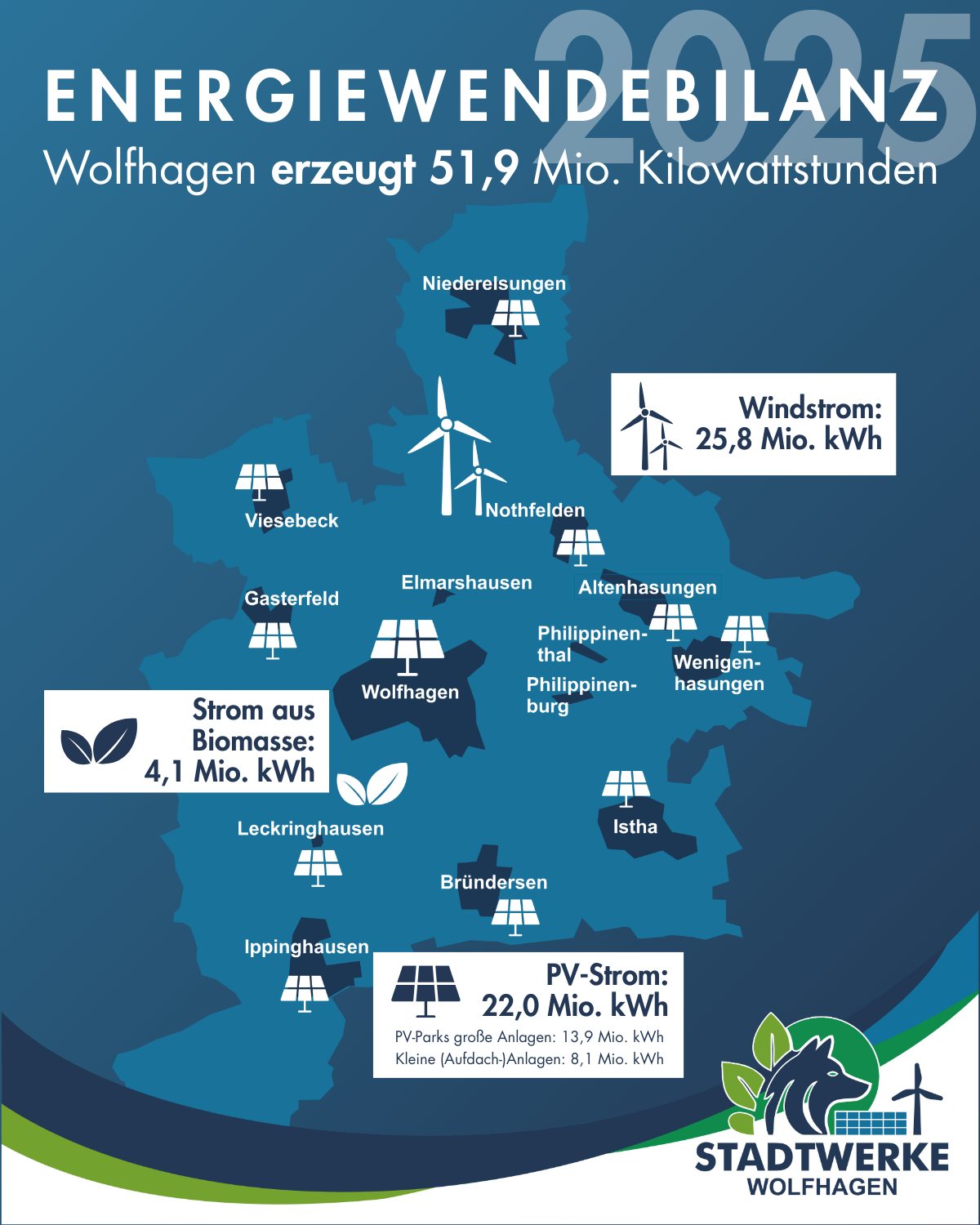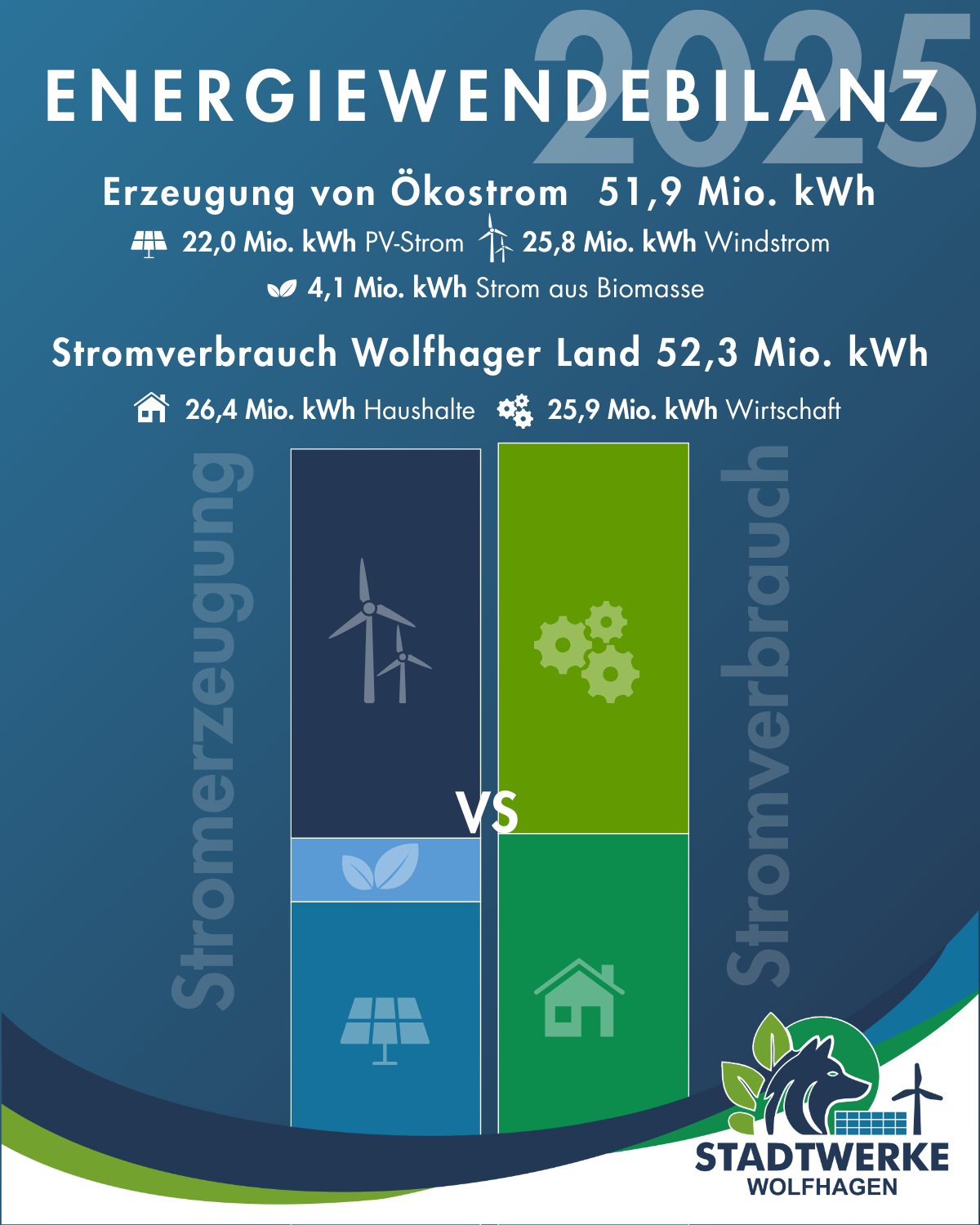 Nahezu eine Punktlandung: 99 Prozent der Strommenge, die Wolfhager Haushalte und Betriebe 2025 verbraucht haben, wurde 2025 in unserer Stadt erzeugt. Der Windpark, große und kleine PV-Anlagen und die Biogasanlage sind die Stützen der erneuerbaren Erzeugung.