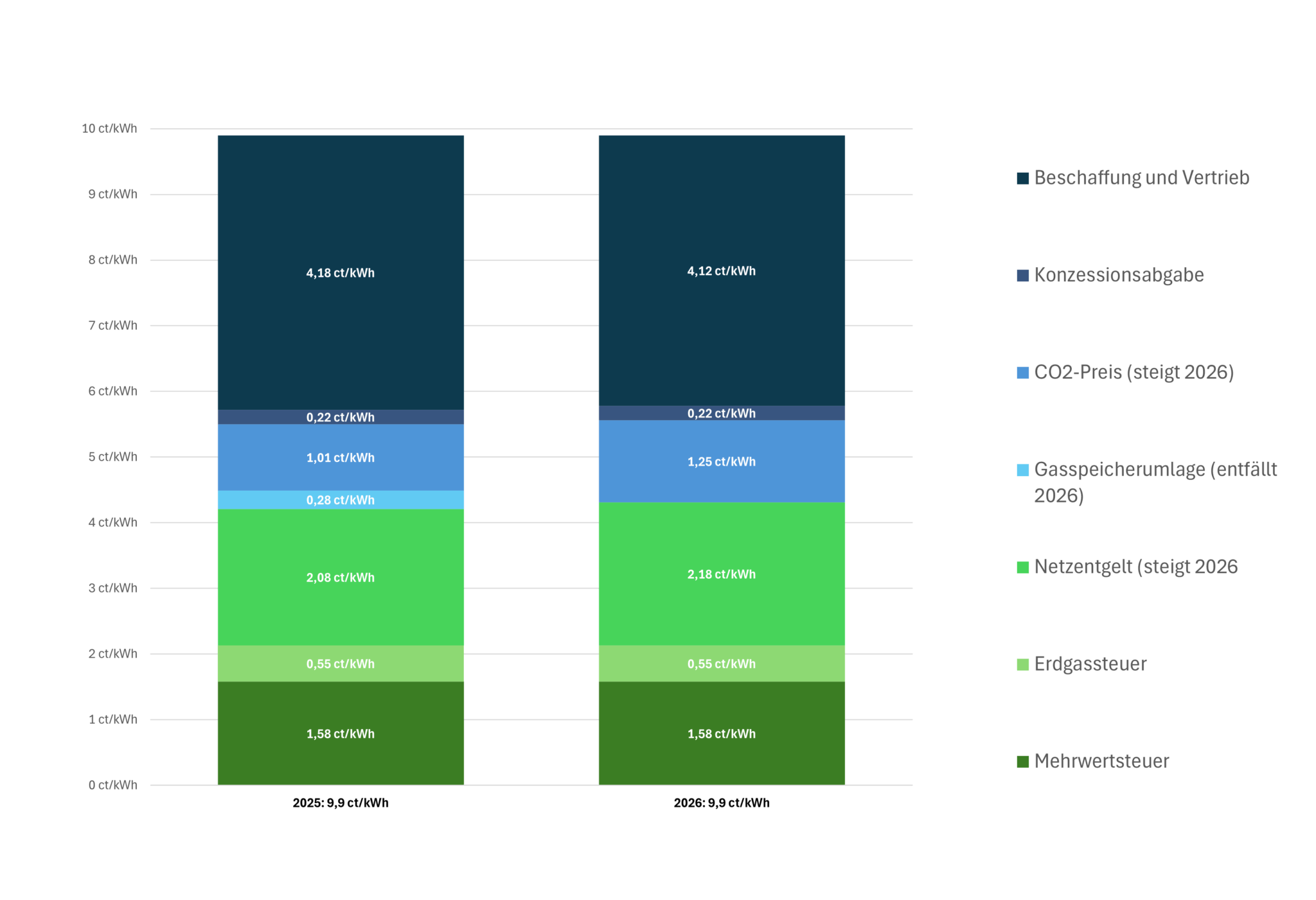 Gute Nachrichten: Zum Jahreswechsel bleibt unser Erdgaspreis stabil und kostet im Tarif SWW-Gas weiterhin nur 9,9 ct/kWh. Der Wegfall der Erdgas-Speicherumlage gleicht den Anstieg des CO₂-Preises nahezu vollständig aus. Für Sie bedeutet das: keine Veränderung Ihres aktuellen Erdgaspreises, trotz des Anstiegs des CO2-Preises.